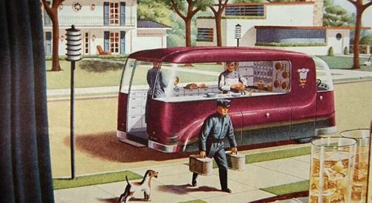 Who had the foresight to envision DoorDash or UberEats 80 years ago? The biggest difference is that, rather than delivering ready-to-eat meals from a custom vehicle, most deliveries today are made by a 2008 Chevy Cobalt or similar car. (One has to appreciate the chef’s jacket on the cook).