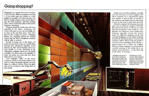 Niel Ardley’s book “School, Work and Play (World of Tomorrow)”, published in 1981, gives a surprisingly accurate view of e-commerce, right down to automatic replenishment of weekly needs. The decision to highlight bananas being grabbed by a robotic arm is an interesting one – what are the odds that the machine knows to pick a ripe bunch of bananas and that none get crushed?
