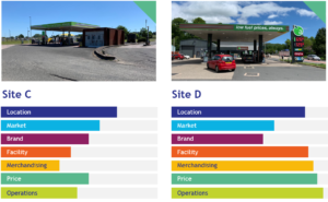 While both sites rank similarly on location, Site B’s stronger market potential means improvements in other elements see increased return for any business interested in an acquisition. The 7 Elements framework flags facilities, merchandising, and operations as areas where the right investment could lead to better performance.