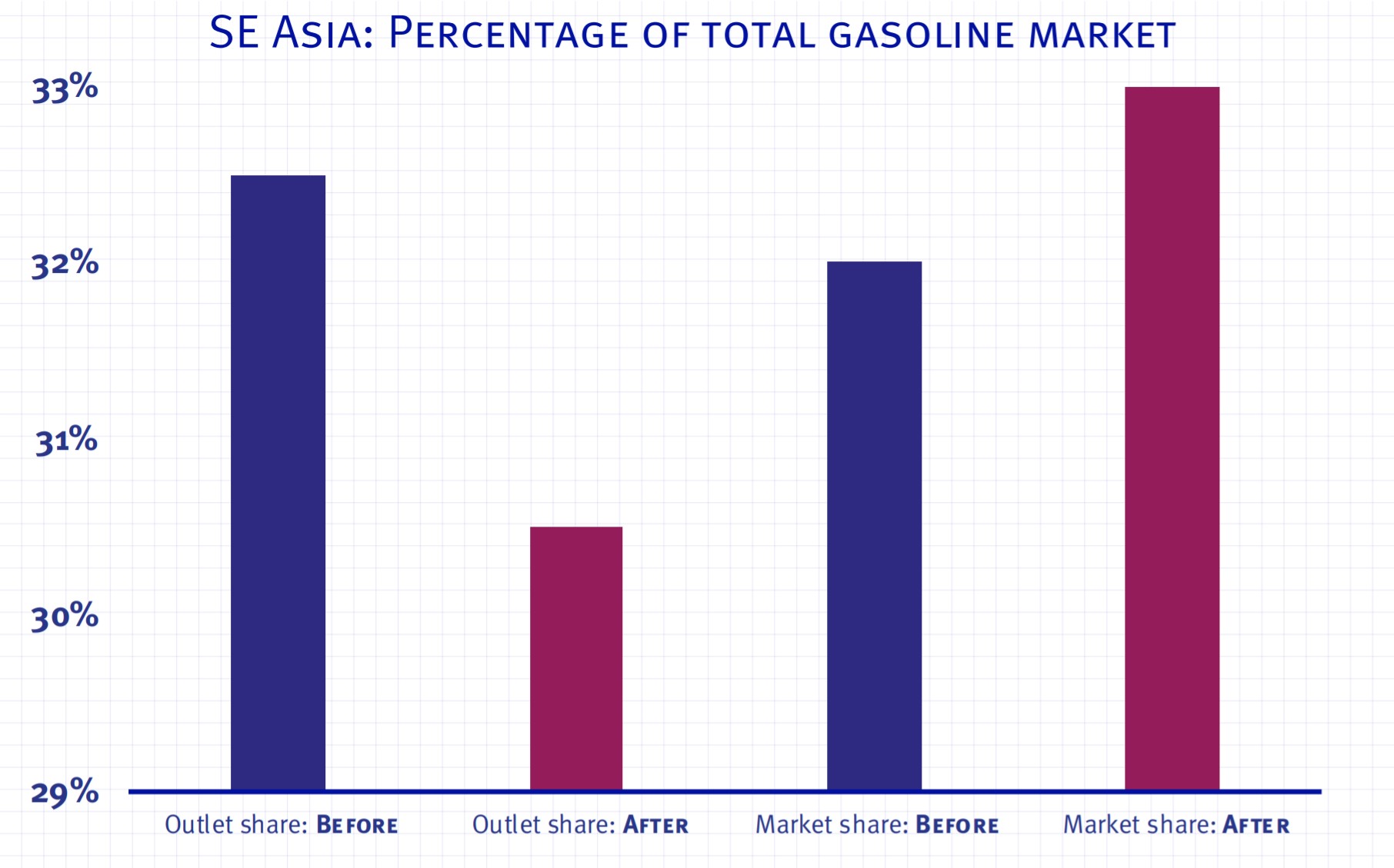 Deregulation unleashed an evolution in the market that kept the client on a path of continuous assessment and adjustment of operations. In spite of the pace of change, the client has consistently improved its gasoline market share. The client has achieved volume performance above the market average and improved its gasoline market effectiveness ratio, even with fewer outlets than the market average. Overall the client’s market share increased 1.2%, while outlet share decreased 2.1%.