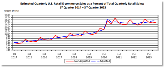 Online shopping will continue to chip away at brick-and-mortar sales. While e-commerce enjoyed a spike in sales during the pandemic, the reality is that e-commerce sales as a percent of total retail sales are effectively where they would have been in 2023 even without the pandemic (see graph below) and show no signs of slowing down.