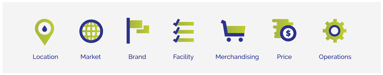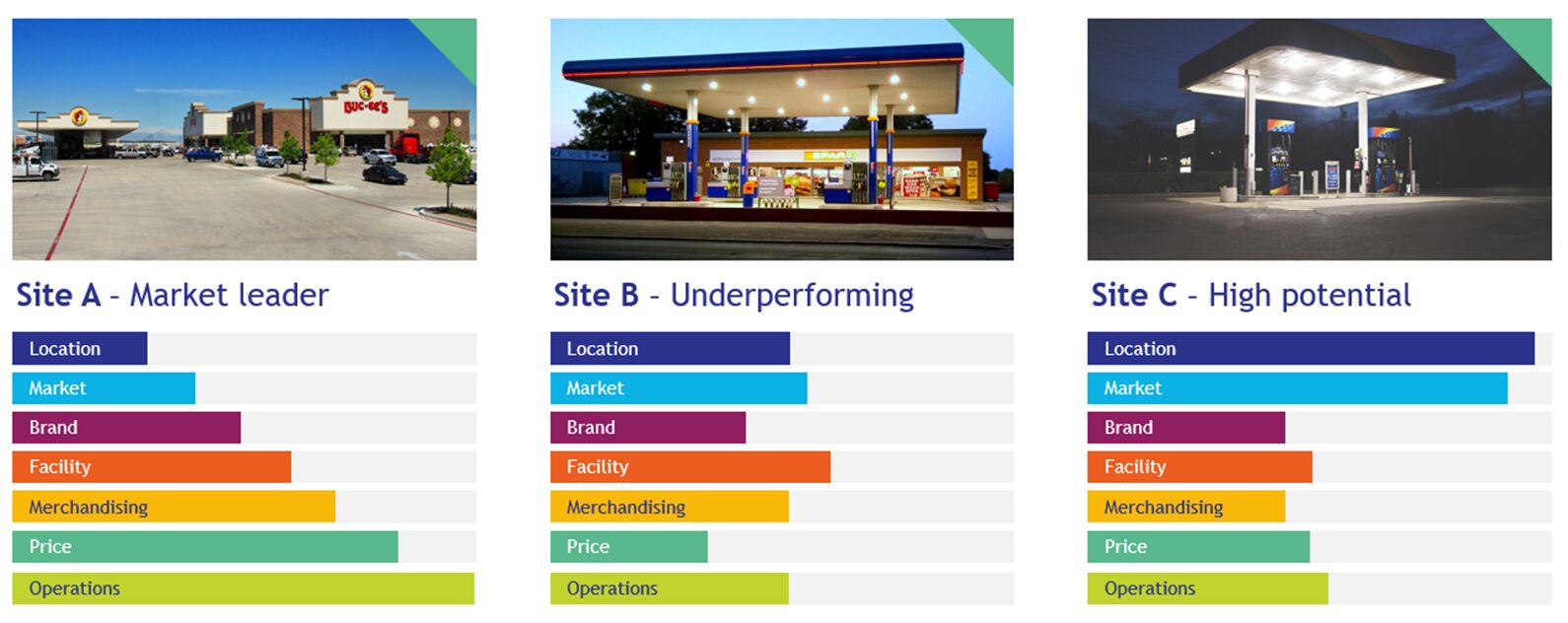 To identify sites that have strong market potential but may be underperforming for other reasons, we would apply Kalibrate’s 7 Elements for Fuel and Convenience Retail Success.