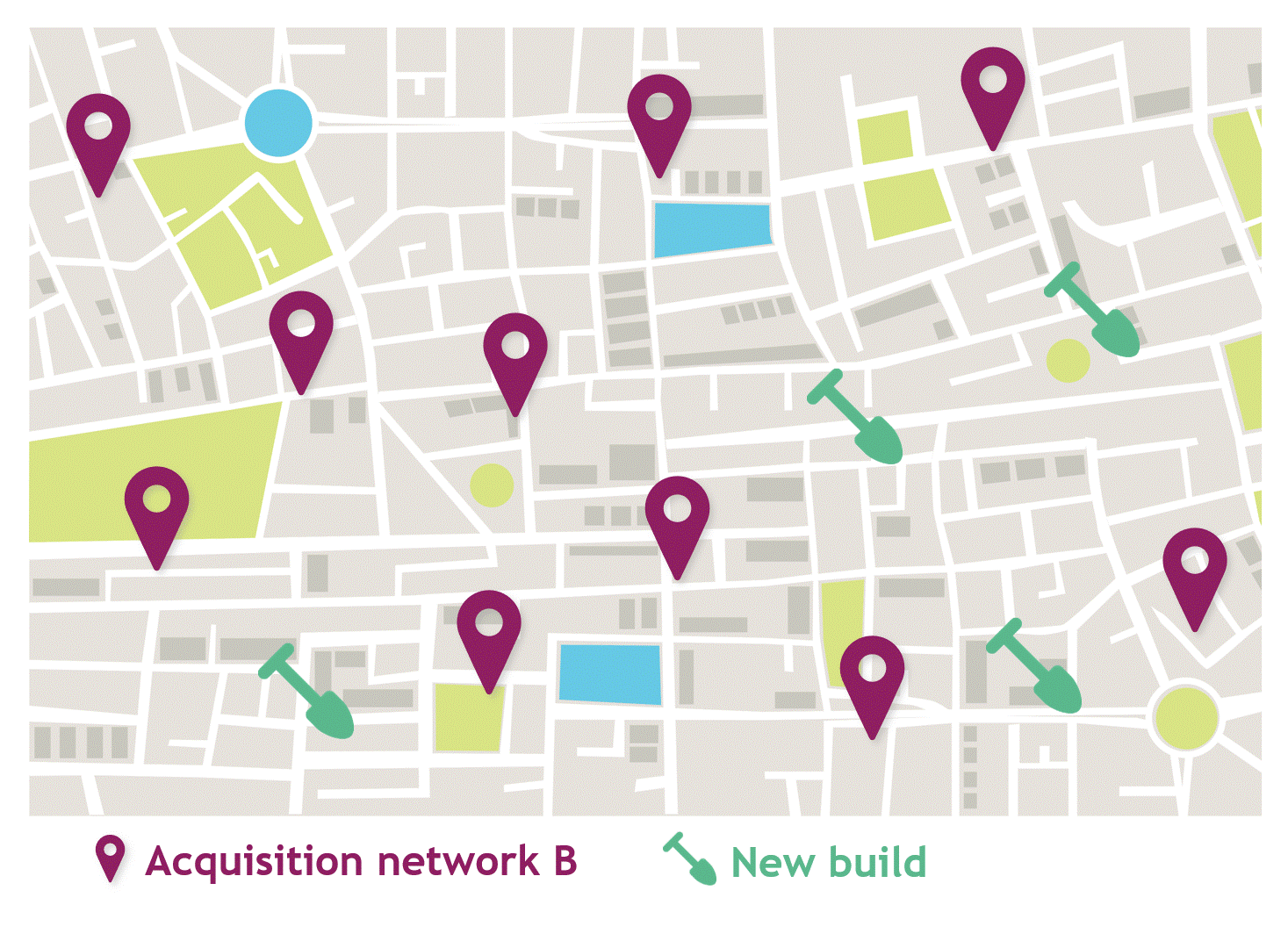 Balancing upfront costs with immediate returns, new build plus acquisition allows the acquiring brand to gain some immediate returns while managing costs of new builds and upgrades to acquired sites as capital allows.