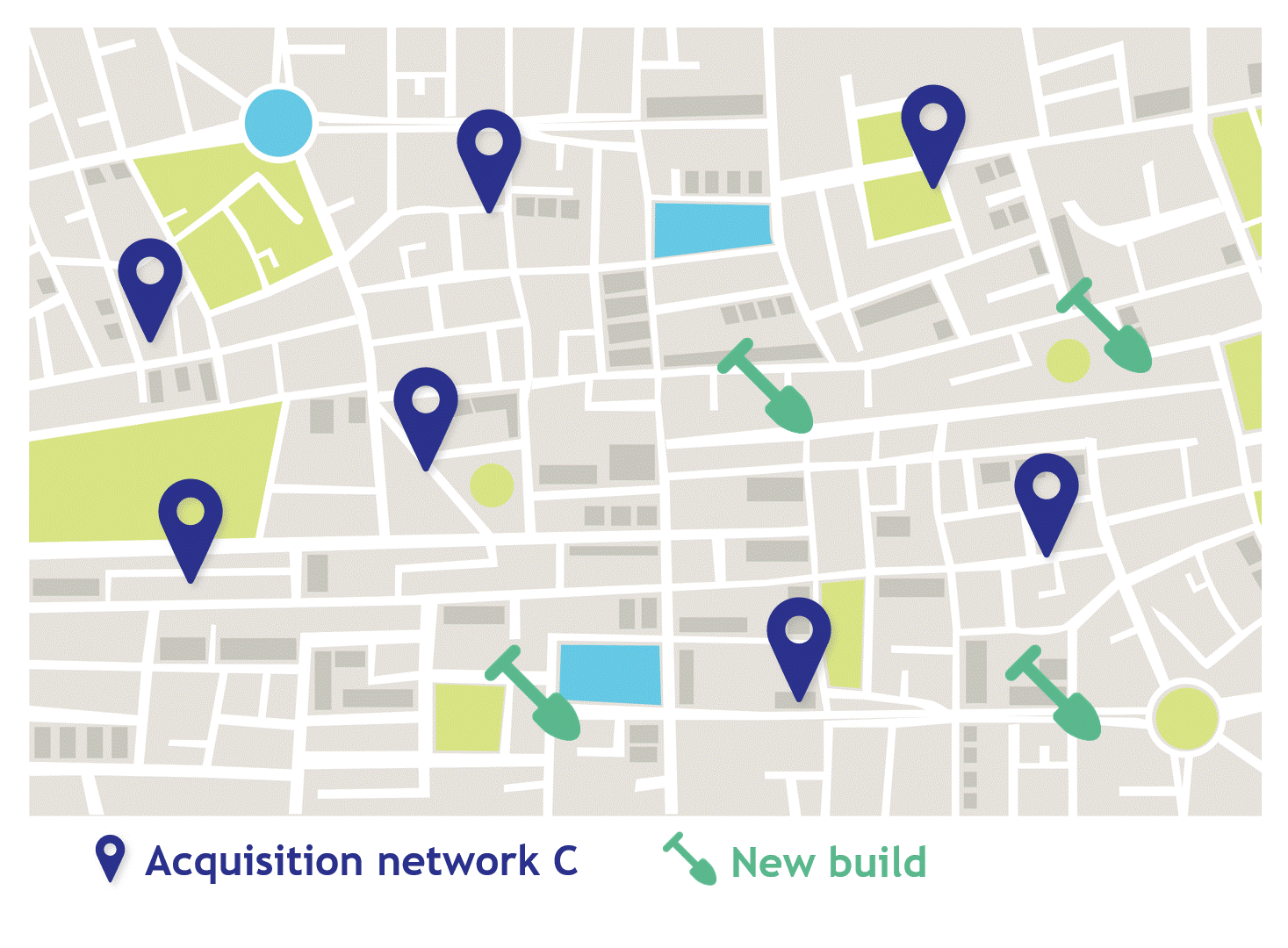 In the third acquisition candidate, the combination of acquired sites plus the new build locations would enable critical mass while remaining in the sweet spot and avoiding oversaturation. Market share would surpass the levels expected based on the number of outlets. In this hypothetical situation, acquisition portfolio C plus the new builds would be the optimal target.