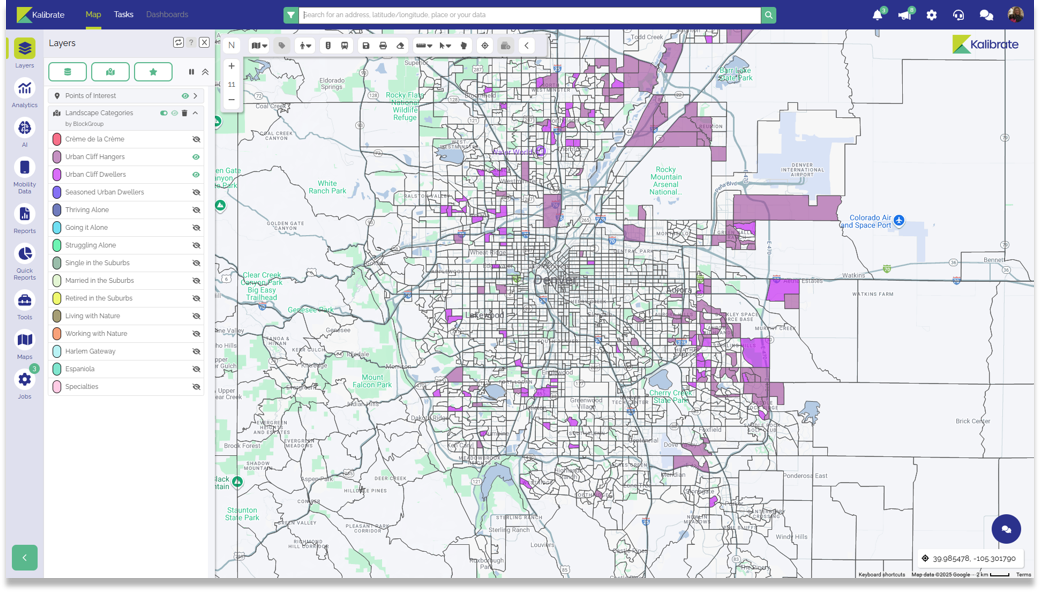 In this screenshot from the Kalibrate Location Intelligence platform, two segment classes are shown in the Denver market.