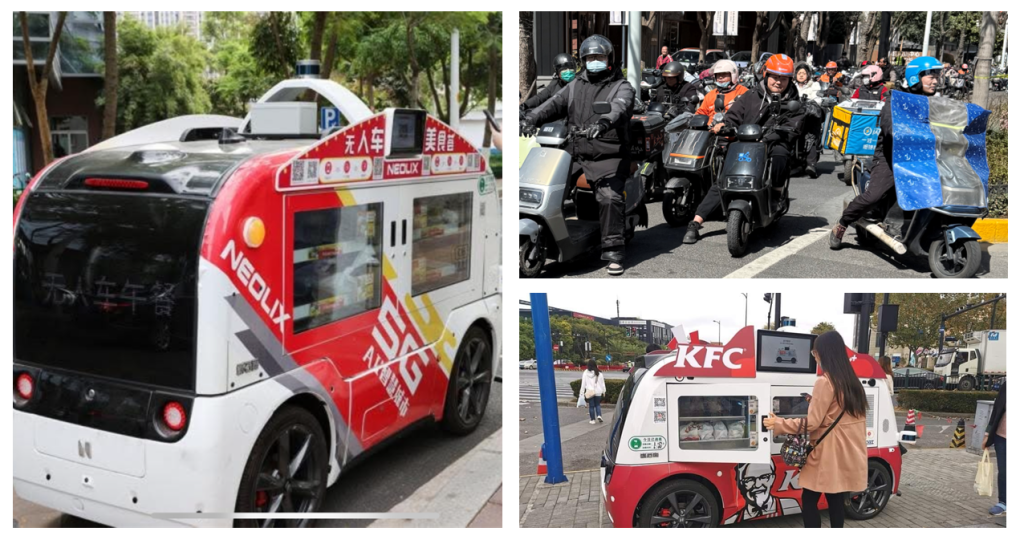 Delivery is part of the relationship as much as the offer is. Two‑wheel couriers, a sea of blue and orange helmets on the road, provide flexibility and scale, while providers like Neolix roll out autonomous vehicles to improve speed and consistency. Exactly how autonomy scales will vary by market, but the expectation for fast, predictable fulfilment will travel.