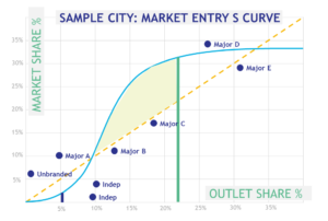 Through application of models for different market entry strategies, we can provide an S-curve to help clients understand the number of locations they need to achieve the target market position. The thick blue line at the far left of the S-curve is what we call critical mass – the volume of sites required to be effective in that market. Open fewer and you will lack the required brand exposure to make a big impact in the market.