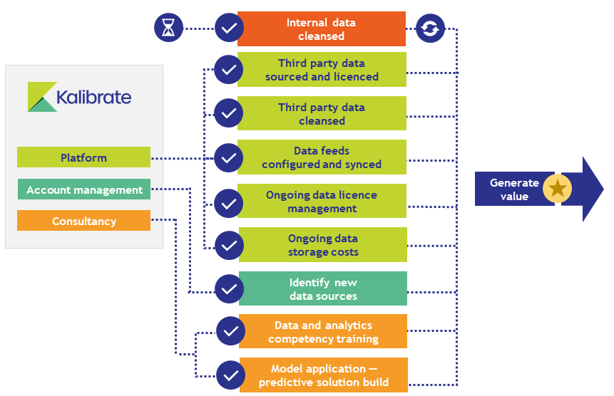 - Kalibrate delivers training, the client’s teams build their own model, and deploys in platform